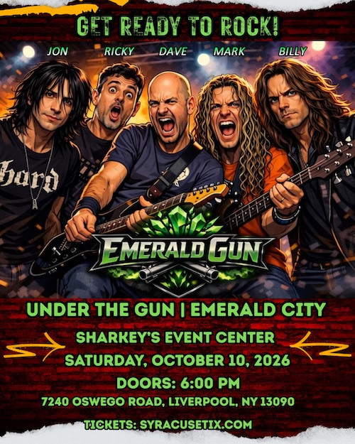 Featuring original members of Under The Gun & Emerald City — Jon Celi, Ricky Caparco, Dave King, Mark Reagan, and Billy Blanchard — this night celebrates 25 years of music and memories with Syracuse audiences.