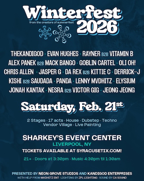 Spanning across two dynamic stages, WinterFest 2026 boasts an impressive lineup of 22 DJs from the buzzing Central, NY music scene. Whether you prefer the high energy of Dubstep, Techno and Drum N Bass or the infectious groove of House, Tech House and Deep House, there’s a stage to suit every groove-seeker.